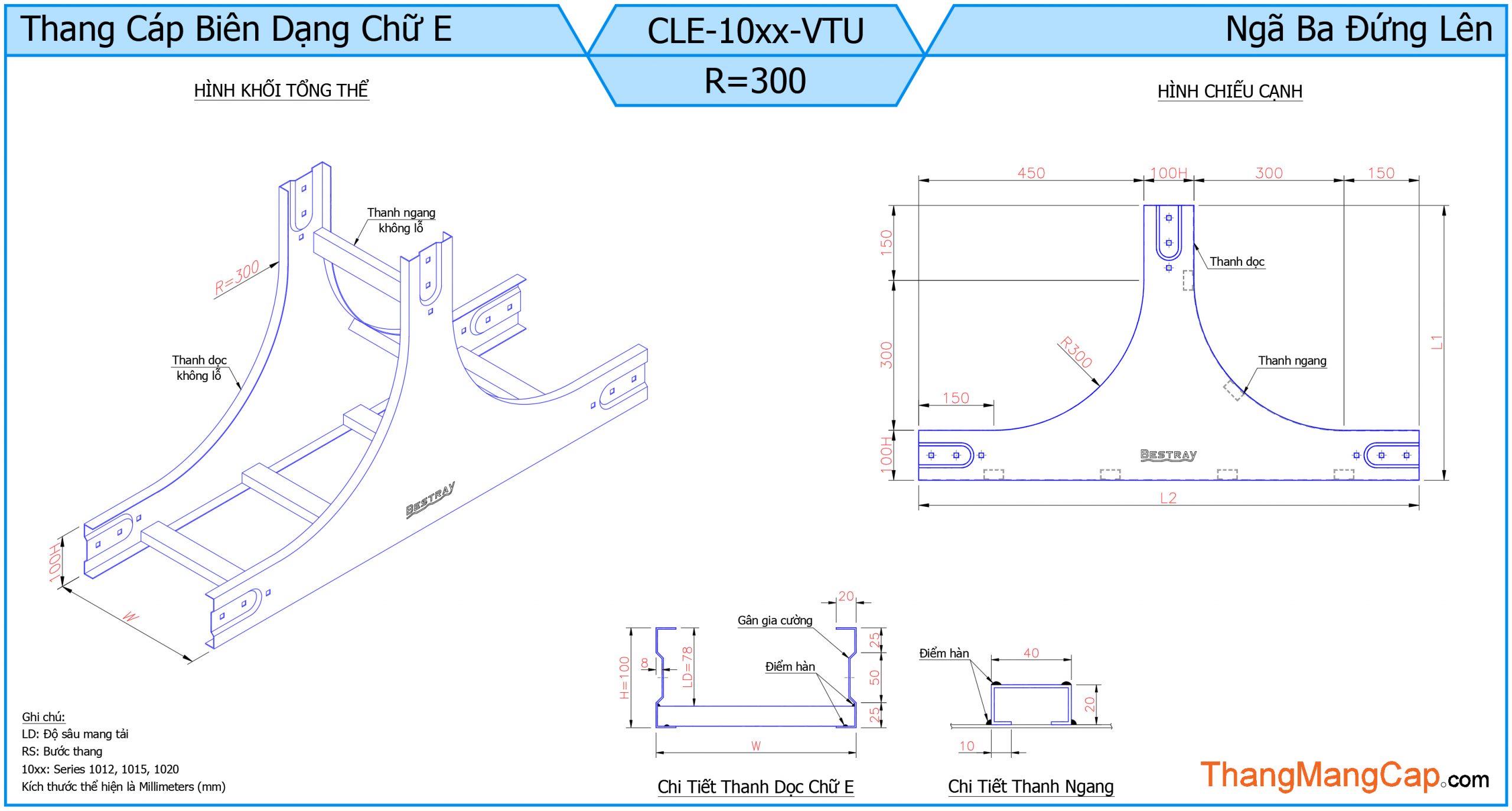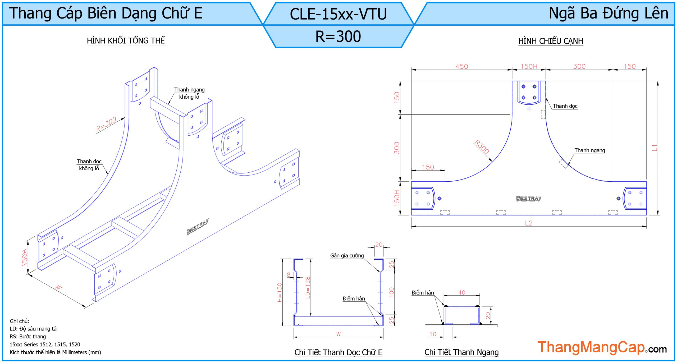 - Kích thước: Đa dạng theo tiêu chuẩn thang cáp CLE, phù hợp với các loại cáp điện từ trung bình đến lớn.