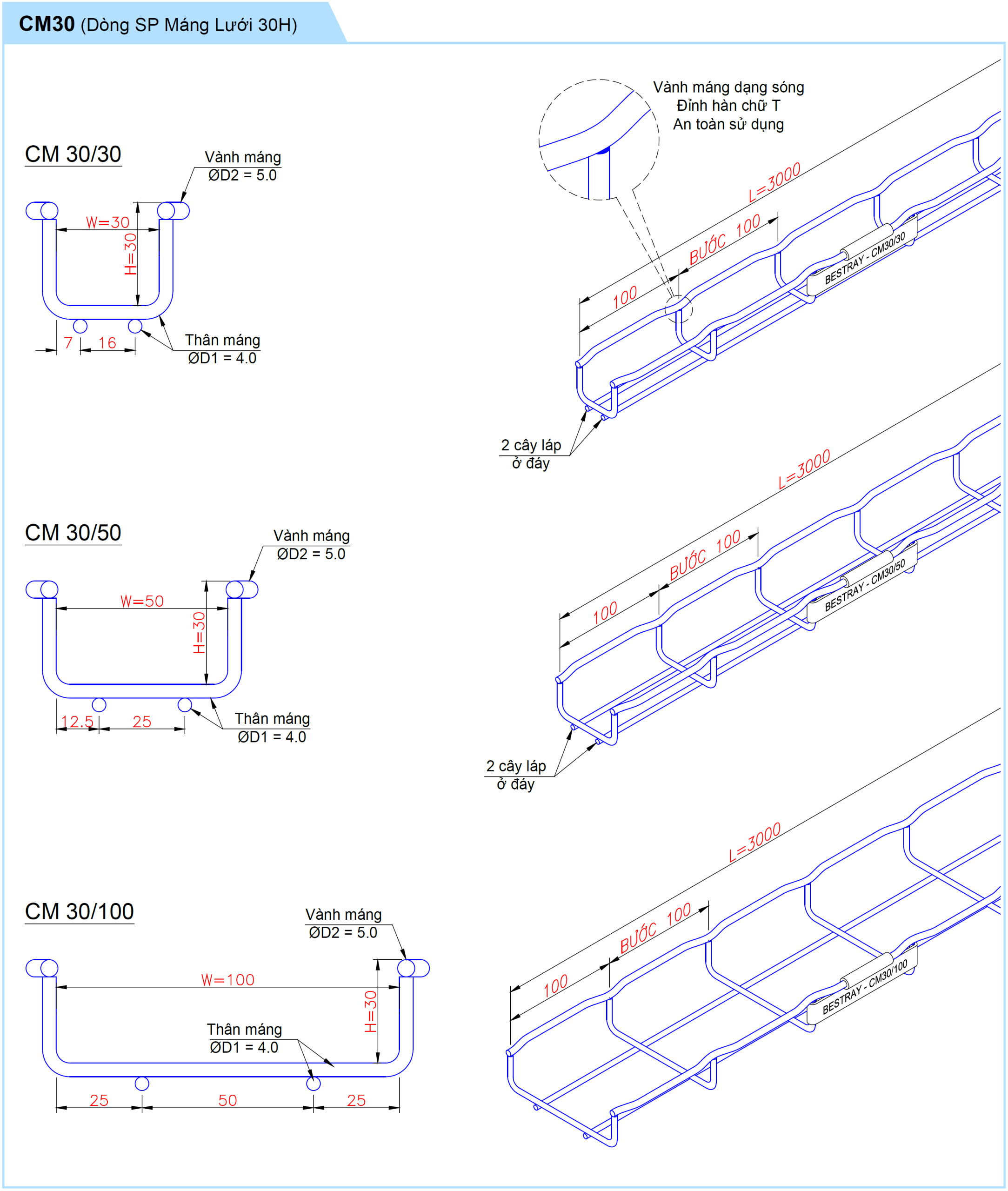 – Vành máng cáp lưới dạng “Sóng”, được thiết kế nhằm gia tăng độ cường độ cứng cho cấu trúc theo phương đứng và chống vặn xoắn theo phương ngang, giúp máng cáp lưới phát huy tối đa sức mạnh, nâng cao khả năng chịu tải (cao hơn vành thẳng)