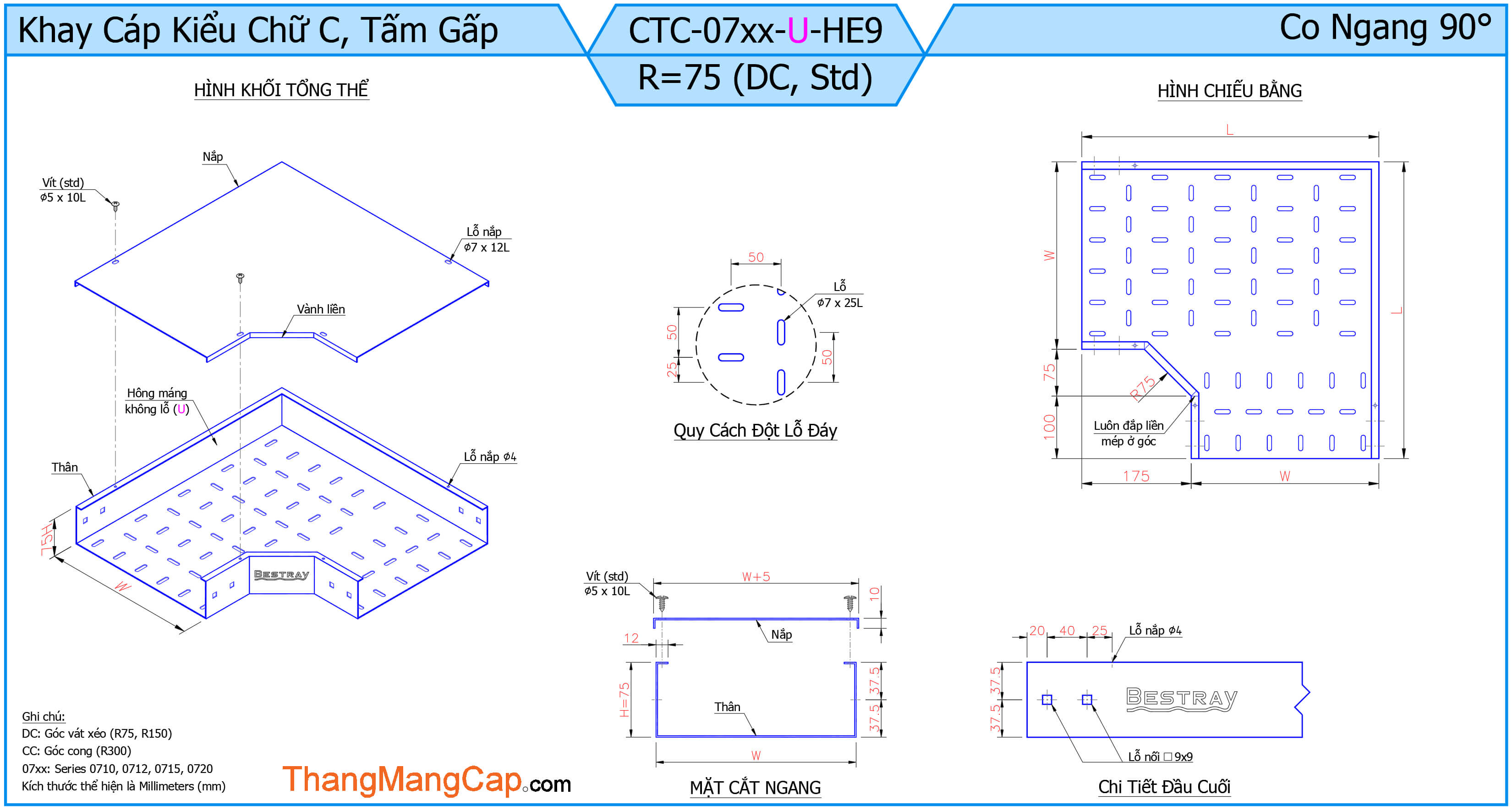 - Thiết kế chính xác: Góc 90 độ được gia công chuẩn xác, giúp lắp đặt dễ dàng và đồng bộ với khay cáp thẳng.