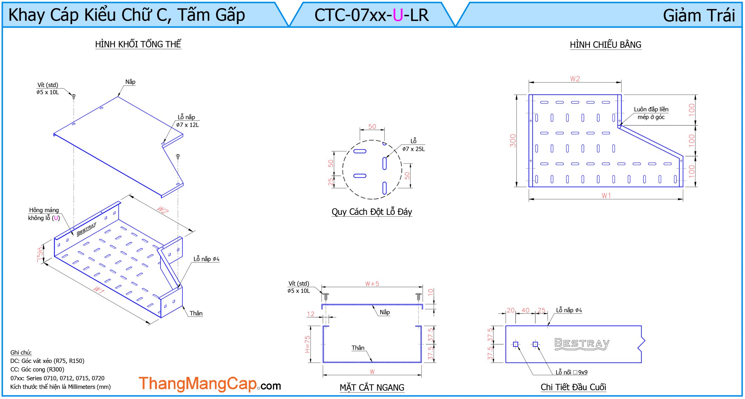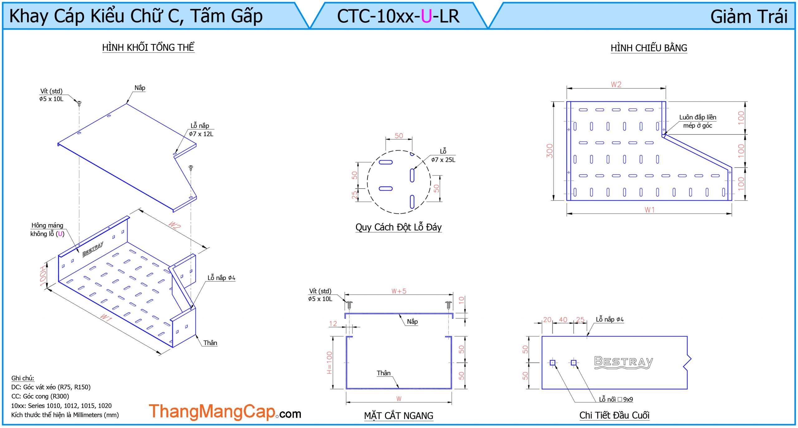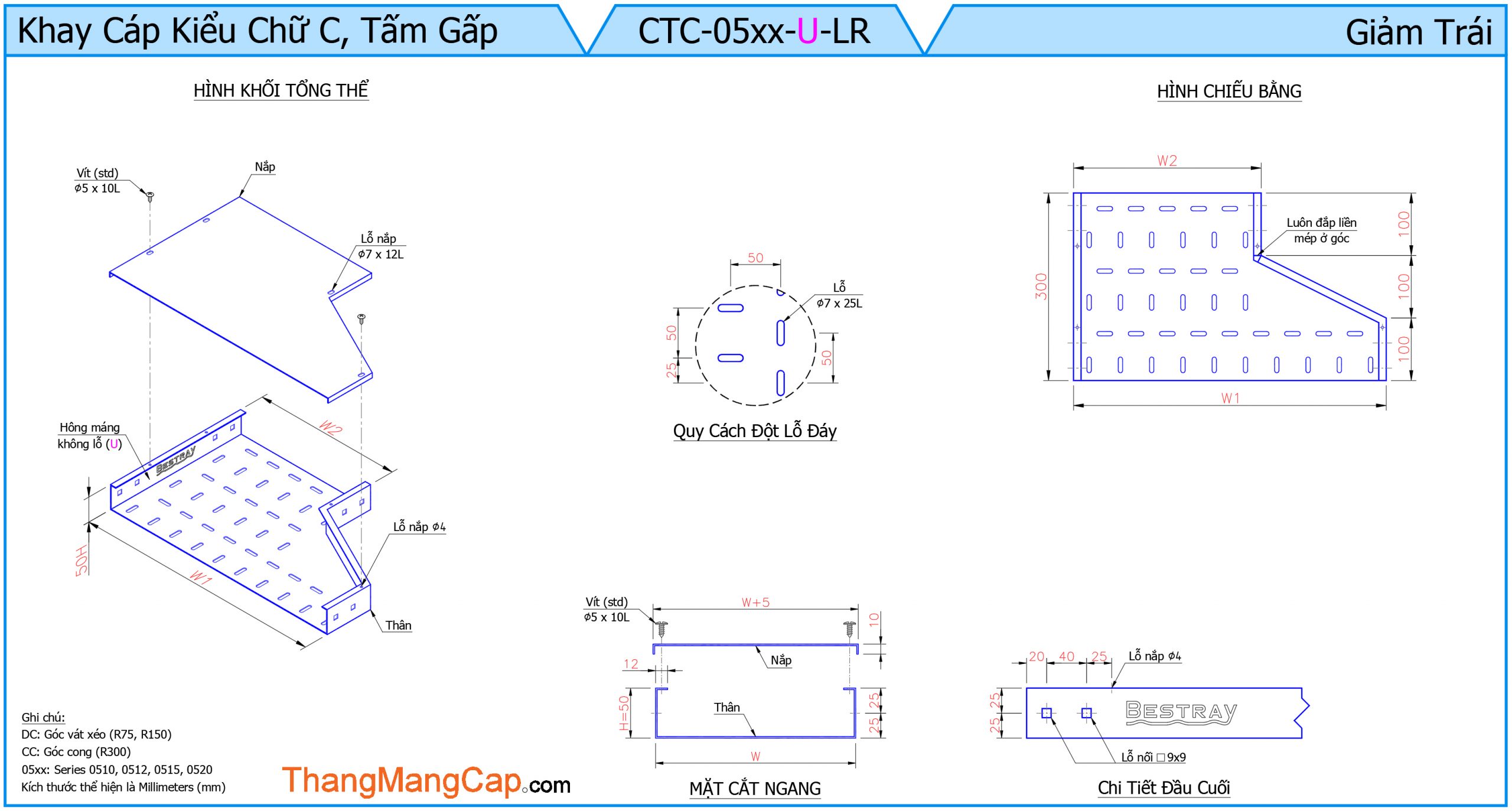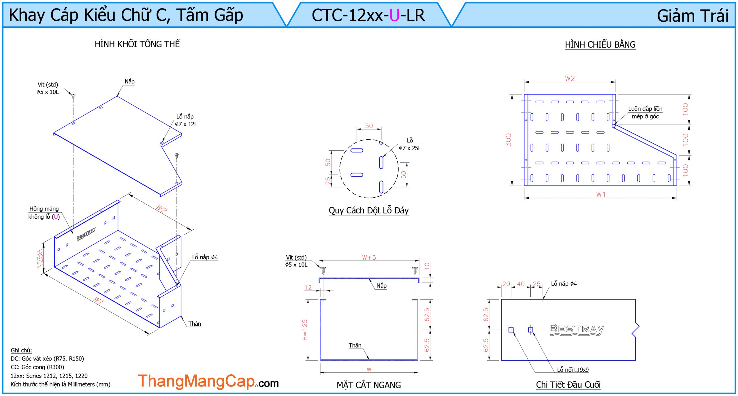 Khay Cáp (Giảm Trái) là một phụ kiện chuyên dụng trong hệ thống quản lý cáp, được sử dụng khi cần chuyển đổi kích thước chiều rộng của khay cáp theo hướng bên trái. Sản phẩm này cho phép dẫn cáp từ khay có kích thước lớn sang khay nhỏ hơn một cách gọn gàng, đảm bảo tính thẩm mỹ và an toàn cho hệ thống điện.